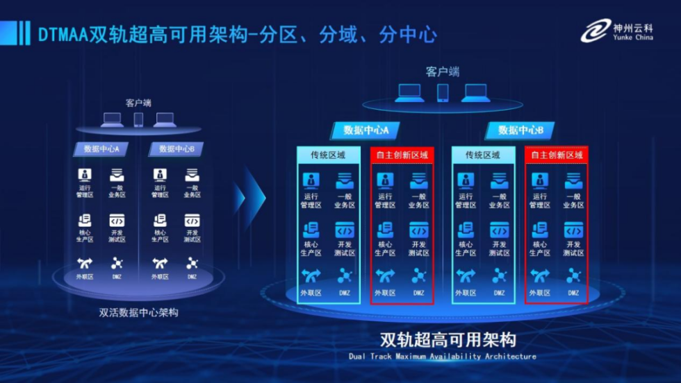 为帮助金融客户更好地应对数字经济时代对可持续性的高要求,实现“信创”与“数字化”齐头并进,尊龙凯时z6com推出了双轨超高可用架构。该架构在双活数据中心的分区调度基础上,增加信创域和非信创域的分域调度,实行信创域与传统域应用全量部署,使双中心运营变为双中心四区域并行运行,互为多活,将“0到1”的单轨建设道路变为分区分域协同的多活双轨超高可用架构。帮助客户在新架构下,保障“信创”的同时解决性能瓶颈,提升稳定性,保证应用可持续性,最终实现信创区域和非信创区域的平滑过渡,完成国产化替代目标。