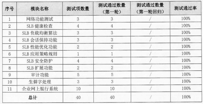功能性方面:测试范围包括网络功能测试、SLB健康检查、SLB负载均衡算法、SLB会话保持功能、SLB安全防护、SLB扩展测试等11个模块,共计执行40条用例,均顺利获得测试。