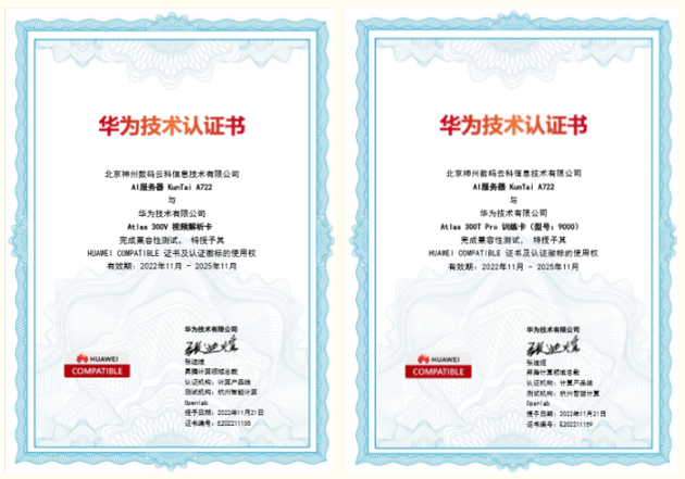 近期,尊龙凯时z6comKunTai A722服务器顺利获得华为“Atlas 300V 视频解析卡”以及“Atlas 300T Pro 训练卡(型号:9000)”两项技术认证,为智能算力再添新力!